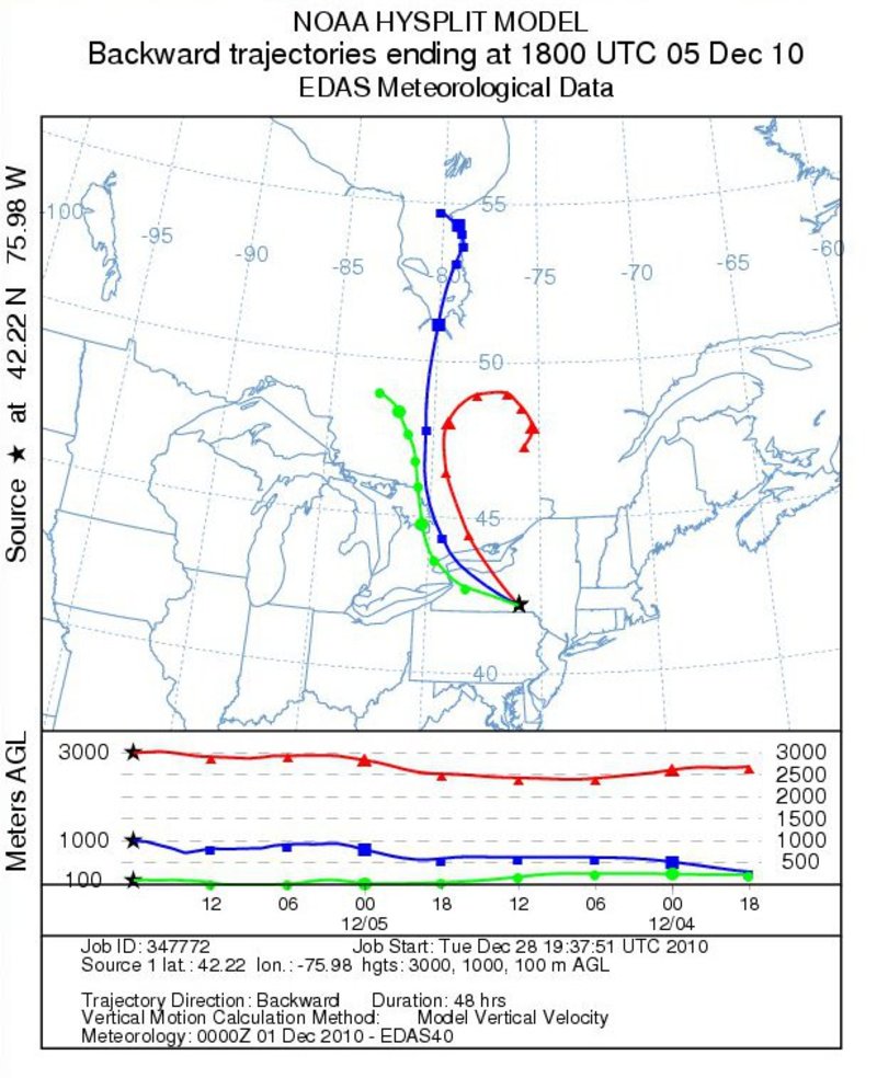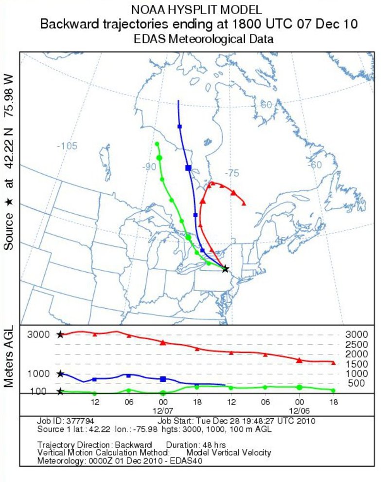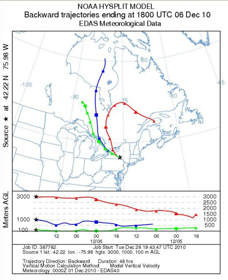 Backward trajectories for BGM December 5-8Notes:Backward trajectories from Binghamton indicated a low-level flow originating over Georgian Bay on the 6th and 7th. Mid-level (3000 m) trajectories can be seen originating over eastern Quebec and rotating west, then south, around the mid-level low pressure center.
