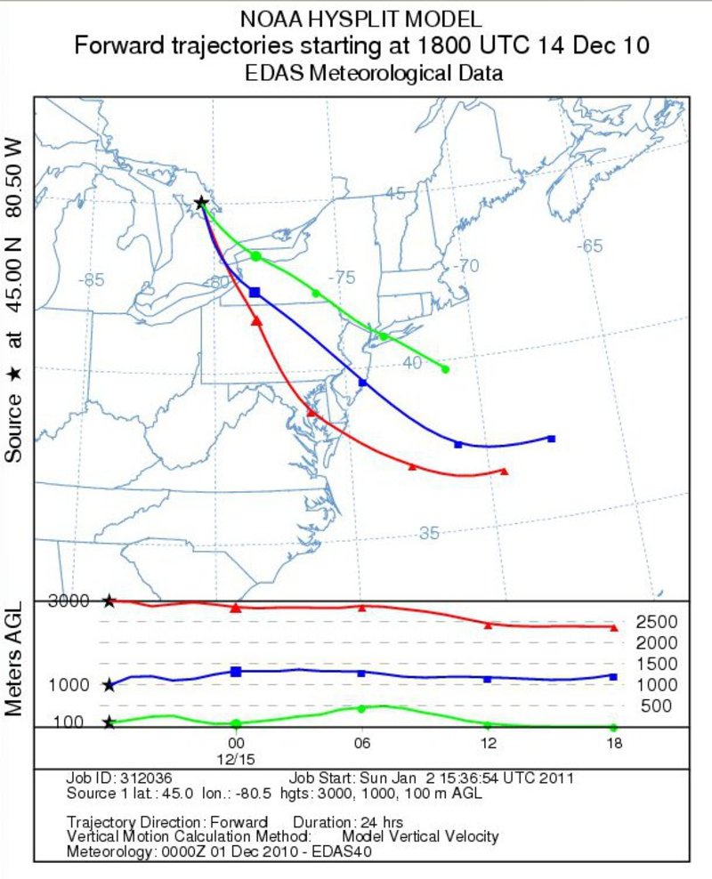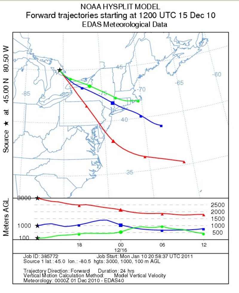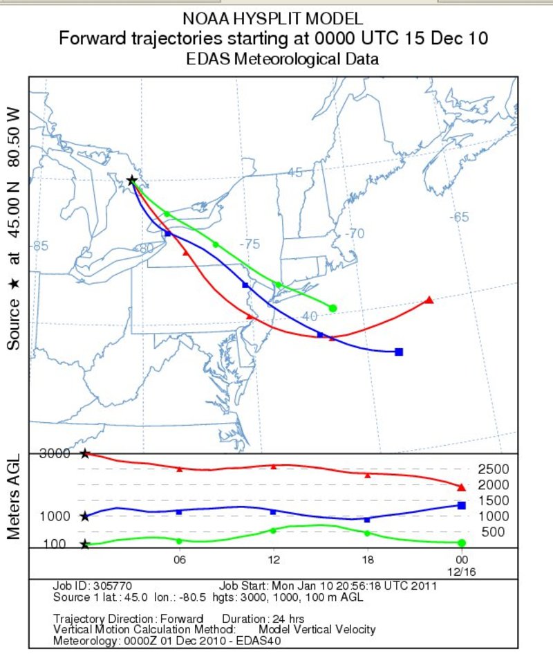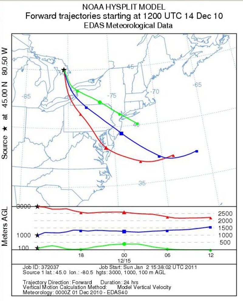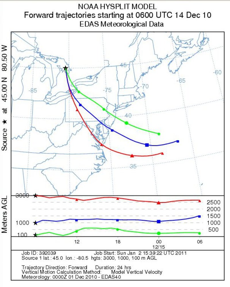 Forward trajectories from Georgian Bay - December 14Notes:Low level forward trajectories from Georgian Bay extended across western New York toward central Pennsylvania on the 14th. The trajectories shifted northward toward central New York by 12z on the 15th.