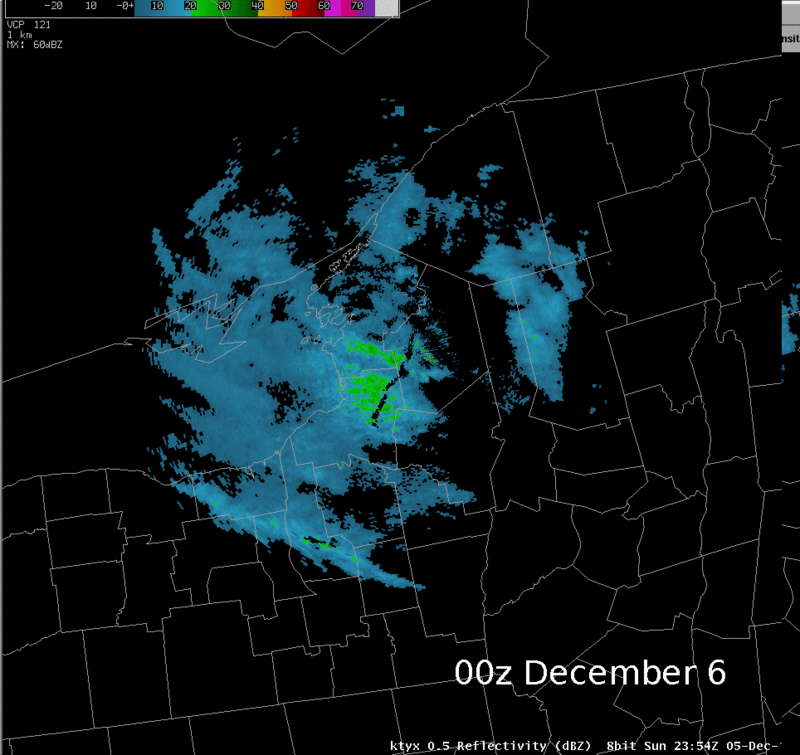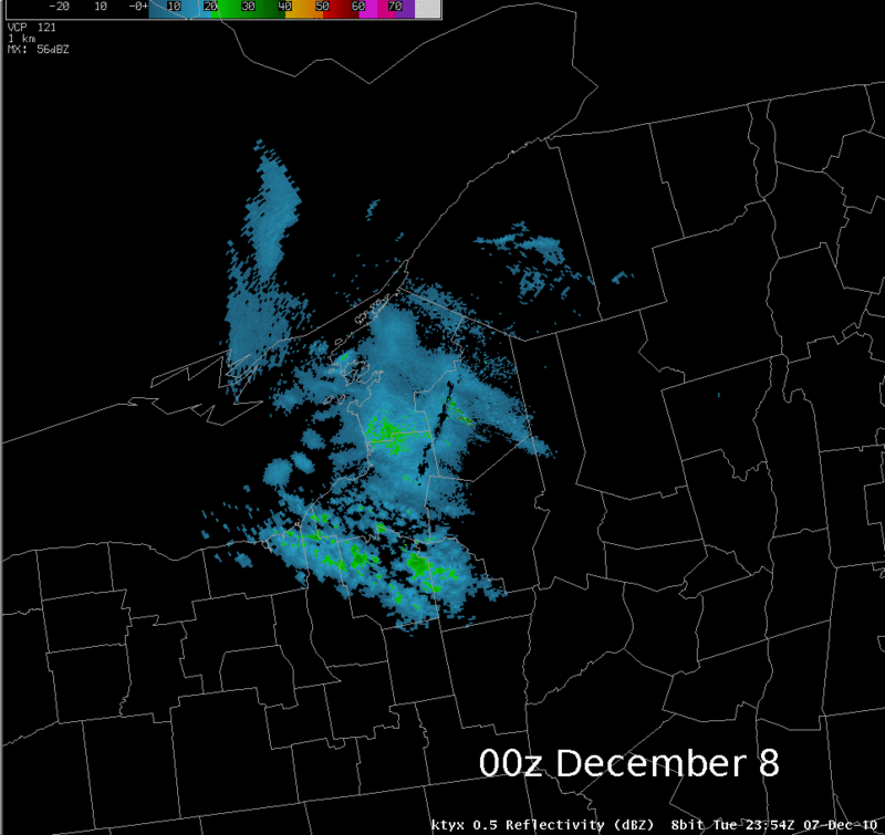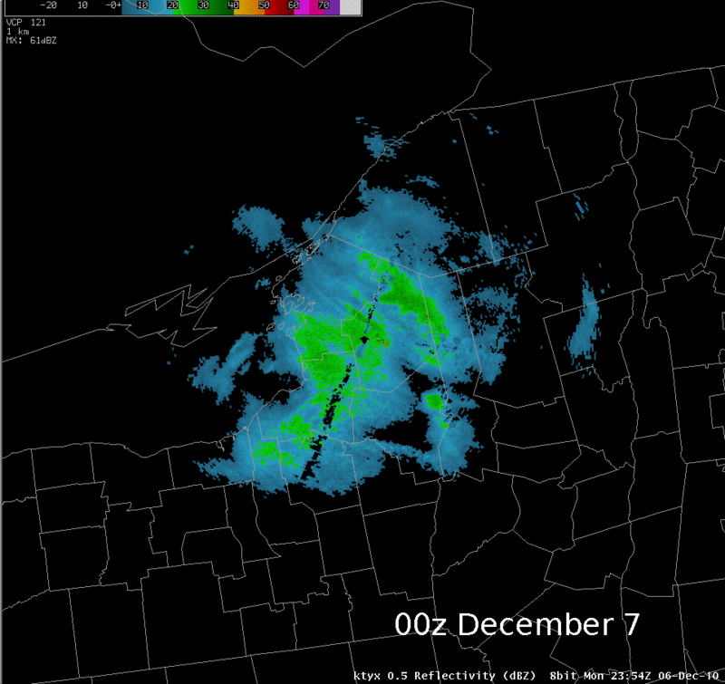 December 5-8 radarNotes:The KBGM radar was down for most of the December 5-8 event. These images are from the KTYX located in northern New York, just east of Lake Ontario. Observations and satellite imagery indicated widespread snow across much of central New York from the 5th through 8th, with the heaviest snow focused over the Syracuse area.