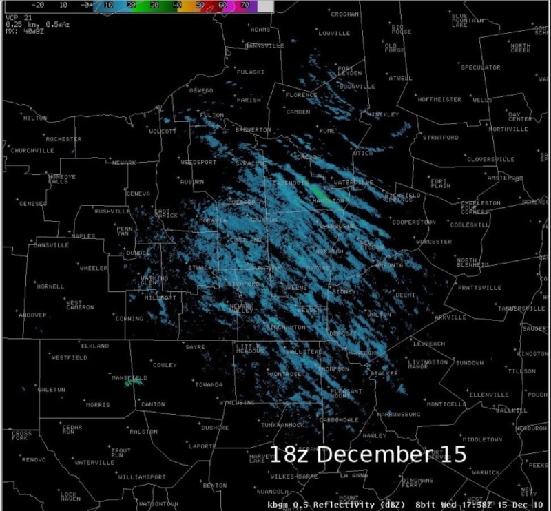 December 15 radarNotes:Weak to moderately strong multi-bands of lake effect snow continued on the 15th. Some localized heavier bands occurred near and just north of Syracuse between 00z and 12z on the 15th, which were not well sampled by the BGM radar.